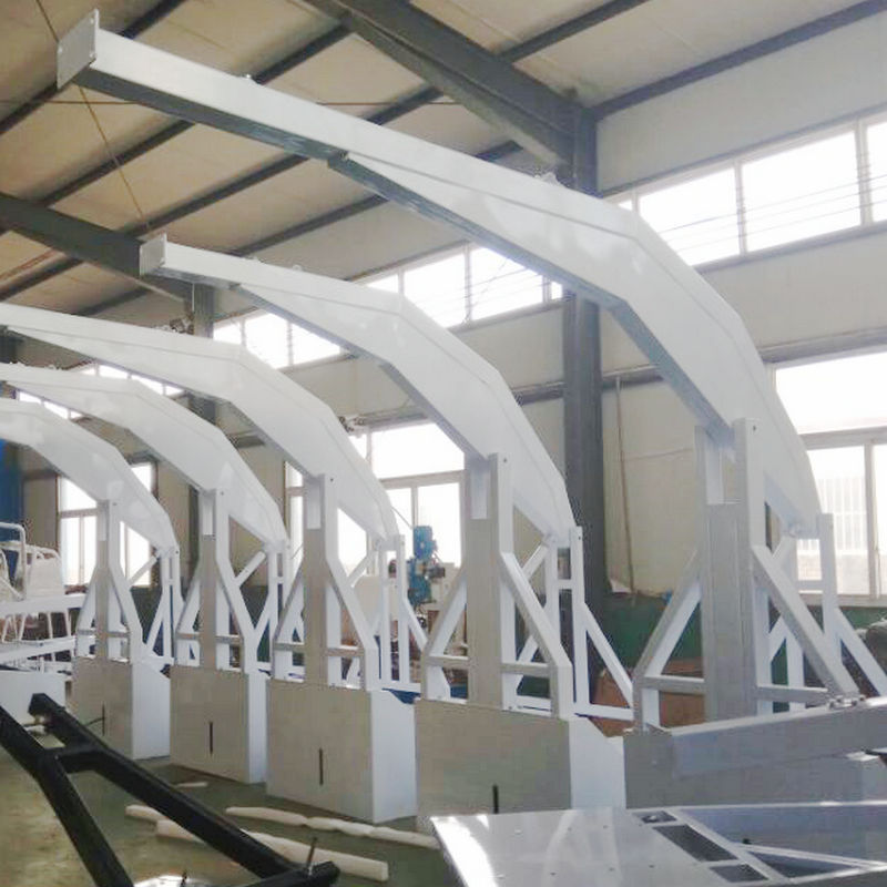 篮球架底座为80x120X8mm、80x120X3mm矩管和δ10mm钢板焊接而成,前、后立臂均为80x120X3mm矩管焊接而成,伸臂为150x150X4mm矩管和80x120X2.5mm矩管和δ3mm钢板焊接而成。上拉杆为φ48X3mm焊管,锁杆为φ60X6mm无缝管,焊缝表面均匀光滑,篮板耳子为精密铝合金材质,采用压铸工艺,外形美观,性能可靠。